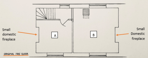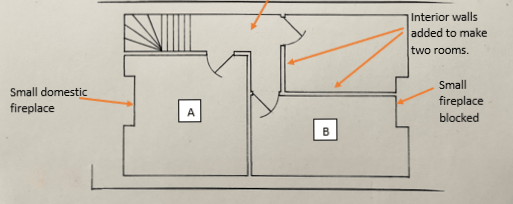 The diagram above shows how we think the floor plan of Number 1 would have looked when first built which is pretty much as it is now minus the stairs in room B..